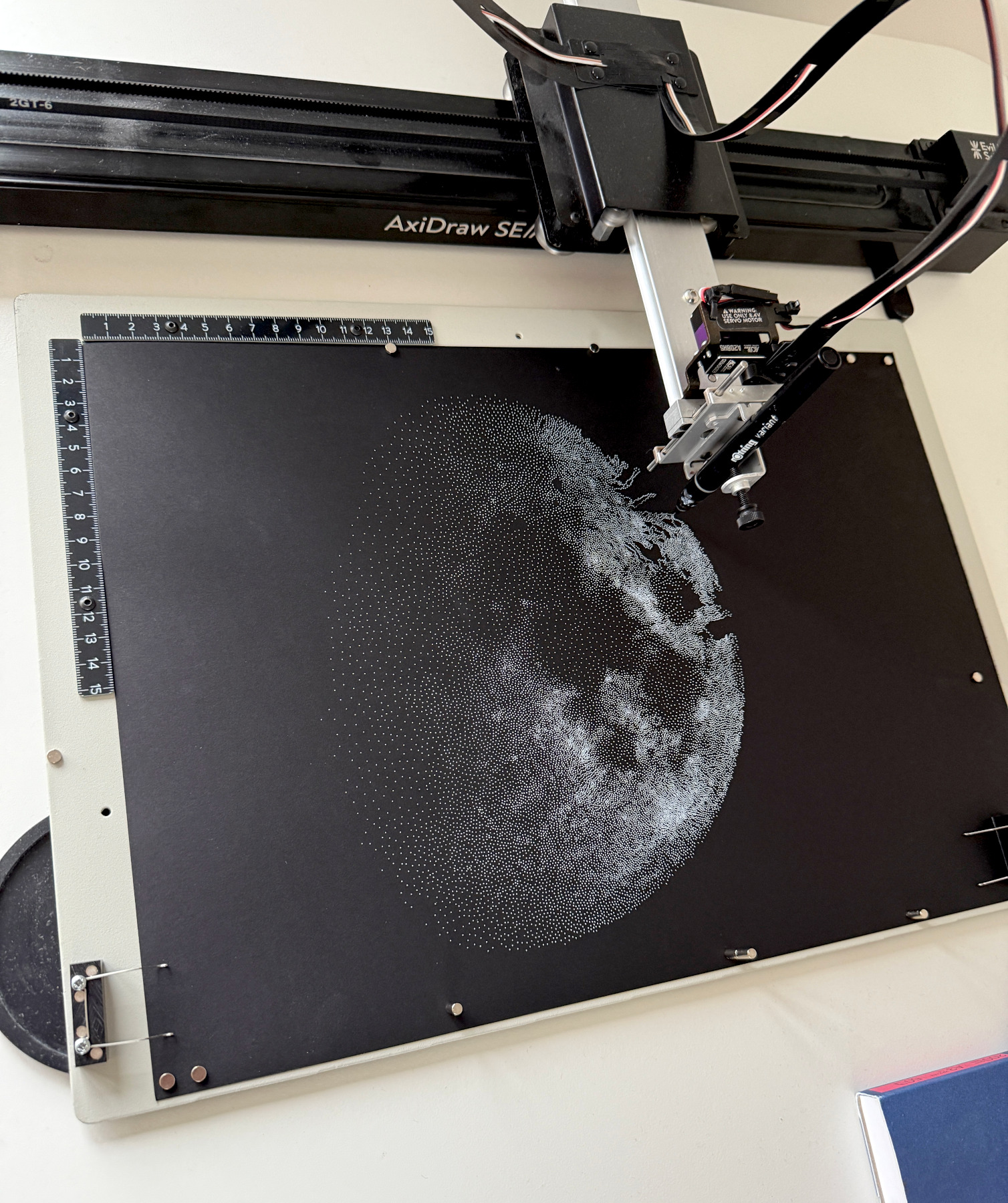 After almost two years (life and other projects happened), I finally plotted something new. I resurrected the Moon project, cleaned it up and published it online. Using a technical pen allowed me to add more detail to the image. It reminded me why I love pen plotting so much, and I hope to plot more in the near future.